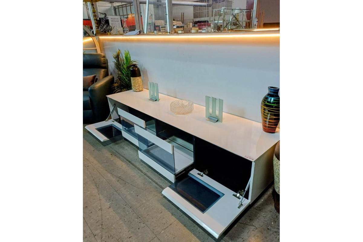 GLOSS WHITE TV UNIT WITH SMOKED GLASS - 2 DRAWERS + 2 PULL DOWN DOORS (#377)