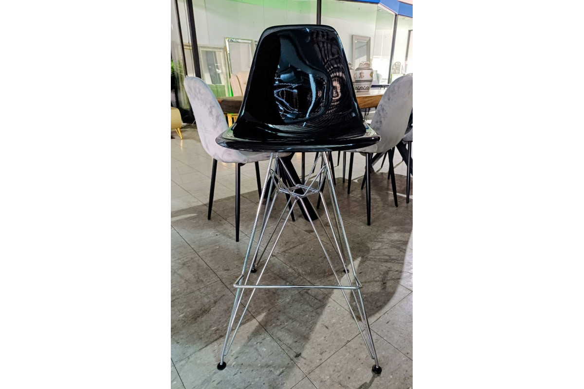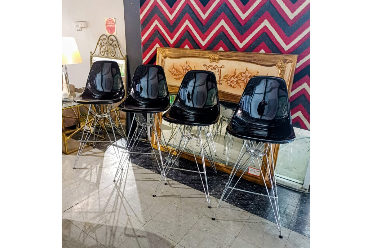 SET OF 4 EAMES REPLICA BAR STOOLS IN GLOSS BLACK WITH CHROME FRAME 65CM SEAT HEIGHTSET OF 4 EAMES REPLICA BAR STOOLS IN GLOSS BLACK WITH CHROME FRAME 65CM SEAT HEIGHT